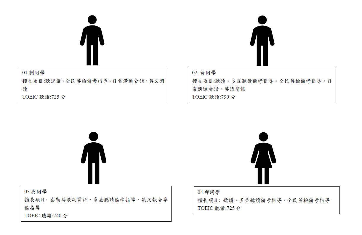 - 本輔導課程皆為免費參與,與TA正式接洽後,可以就想要學習的面向(英文課堂上的問題、如何準備英檢考試、英文對話等等)與TA共同擬定目標後,即可開始進行輔導課程。