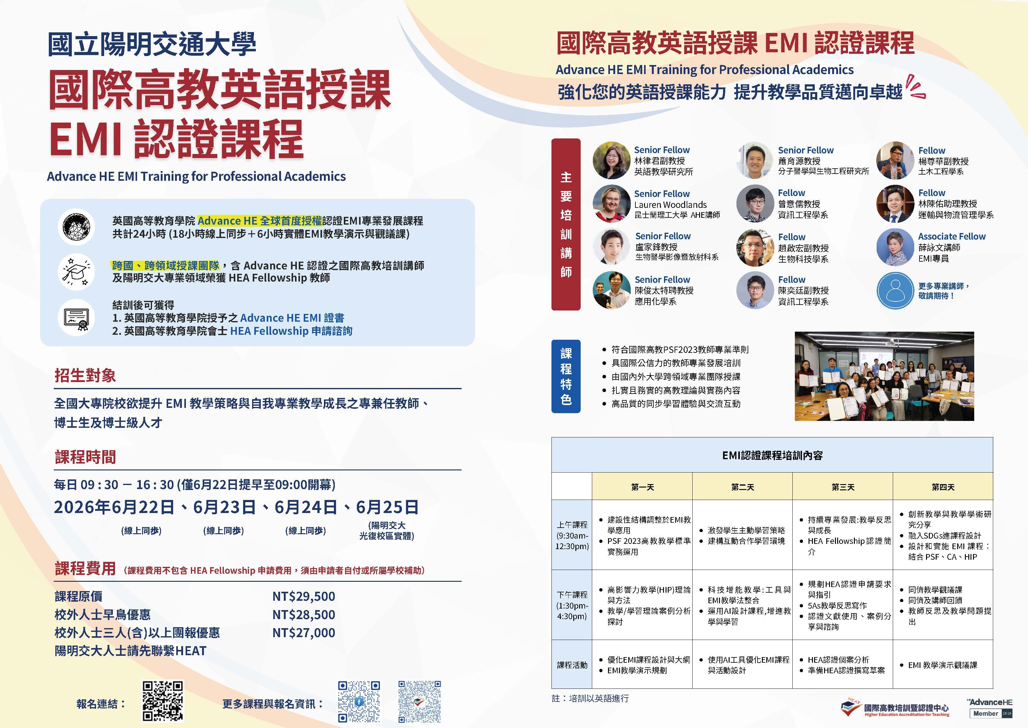 一、「國際高教英語授課EMI認證課程(Advance HE EMI Training for Professional Academics)」,由英國高等教育學院(Advance HE)國際高教培訓講師,搭配該校國際高教培訓團隊講師共同授課,提供兼具國際視野和臺灣實務經驗的高教教學培訓,完成後可獲英國Advance HE結訓證書。
